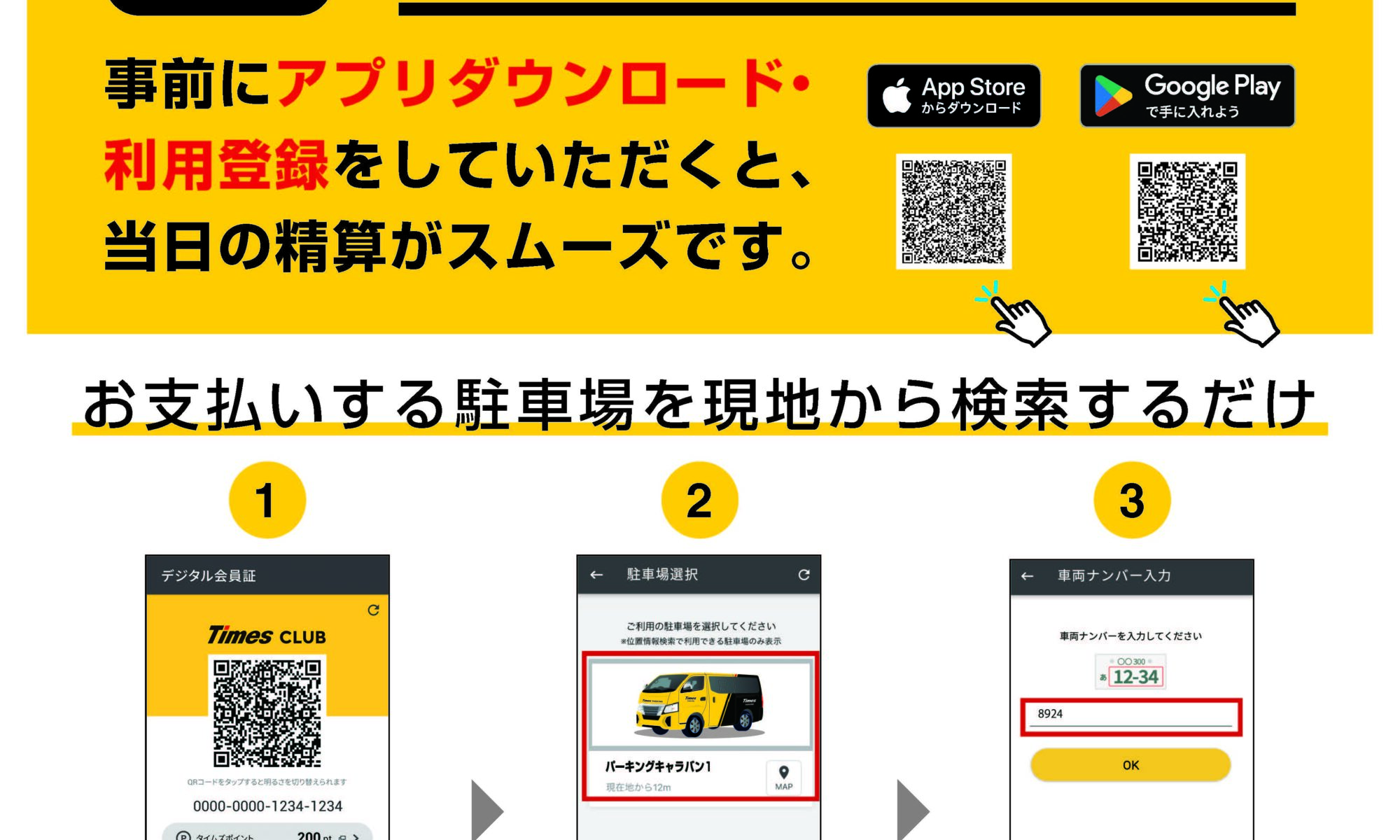 駐車場の精算にはタイムズクラブアプリをご利用くださいましたら事前精算機に並ばずにお手元のスマホなどの端末で精算できます。