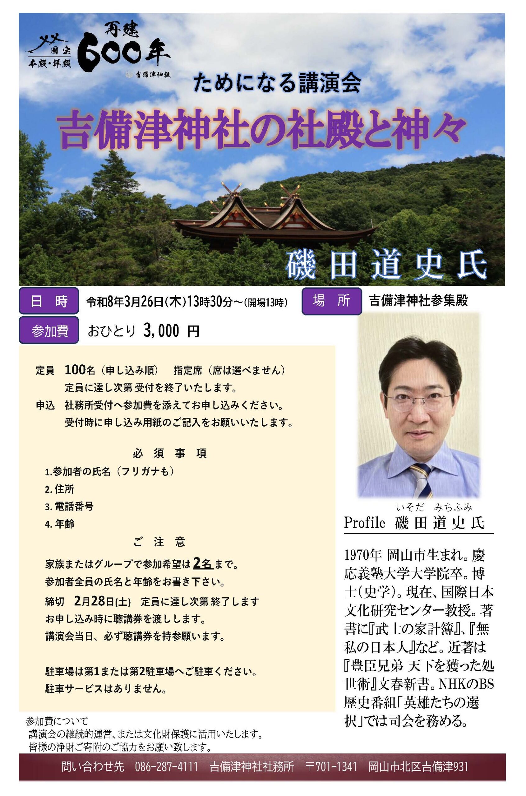 申込先:吉備津神社社務所にある申込書を記入の上、